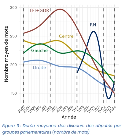 Nous avons donc vu que sur la période 2017-2024, en faisant attention à certains pièges, on trouve des résultats bien différents de l'étude, et même une tendance différente : non, les députés ne font pas des interventions plus courte pour pouvoir faire des TikToks (plateforme qui a par ailleurs commencé à être populaire en France en 2020). On peut tout de même trouver qu'une durée moyenne de 200/250 mots (entre 1 et 2 minutes) soit assez courte. Cependant, ce n'est pas surprenant puisque la grande majorité des prises de paroles à l'Assemblée sont limitées en temps, ce que ne semblent pas prendre en compte les auteurs de l'étude. Les députés n'ont que 2 minutes pour poser leur question au gouvernement (et ils en utilisent généralement moins pour pouvoir répondre ensuite), et sur les amendements, les députés sont généralement limités à 1 ou 2 minutes pour donner leur position (par exemple le défendre). Il est à noter que la limitation en temps de chaque intervention n'est pas la seule manière de faire à l'Assemblée, et que durant les précédentes législatures, la règle pouvait parfois être différente, par exemple un temps limité par groupe au total, mais chaque intervention pouvait faire plus de deux minutes. En bref, (1) rien ne porte à croire que les députés font des interventions plus courtes qu'avant, (2) si les députés font des interventions de moins de 2 minutes, c'est qu'ils n'ont généralement pas le choix et (3) LFI ne fait pas des interventions plus courtes que les autres groupes. Sur ce sujet donc, l'étude aurait tout faux.