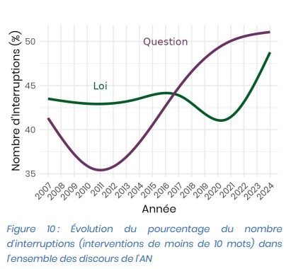 Une autre partie de l'analyse exposée dans l'étude porte sur le nombre d'interruptions et de réactions dans l'hémicycle. Les interruptions sont des phrases criées hors-micro par les députés lorsqu'un autre député est en train de prononcer un discours au micro. Cela peut être « Très bien » ou « C'est faux ! », ou encore des blagues voir des insultes. Les rédacteurs de comptes rendus font un travail exceptionnel, mais ils ne sont pas infaillibles, et peuvent manquer des interruptions, ou parfois volontairement ne pas les noter au compte rendu, car elles peuvent être répétitives (certains députés répètent la même punchline en boucle pour être sûr qu'elle soit bien écrite dans le compte rendu). D'après leur analyse, la proportion d'interruptions parmi les interventions a augmenté ces dernières années (voir la figure ci-dessus, extraite de l'étude), ce qui illustrerait selon eux d'une part l'augmentation de la conflictualisation, d'autre part l'augmentation du côté « spectacle ». Pour la conflictualisation, ce n'est pas si clair, car cette augmentation pourrait aussi être due aux députés qui crient sans cesse « Bravo ! » et « Très bien ! » à leurs collègues.