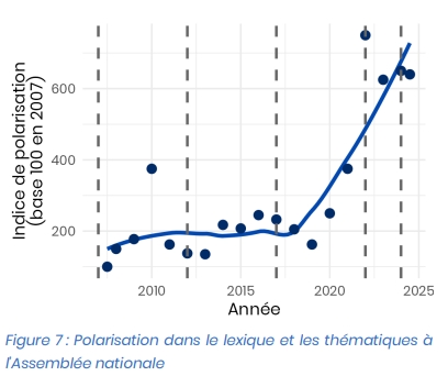 Bien qu'il y ait selon moi un certain nombre de points contestables dans cette étude, il faut reconnaître l'intérêt de certaines analyses proposées, qui témoignent d'un travail important de la part des auteurs. En particulier, il est très probable que la polarisation augmente d'une manière ou d'une autre en politique, et il est possible que les débats actuels soient plus conflictuels qu'il y a 10 ans. Une conflictualité aux sources multiples, et notamment liée au pouvoir plus important des députés depuis que le gouvernement n'a plus la majorité à l'Assemblée.