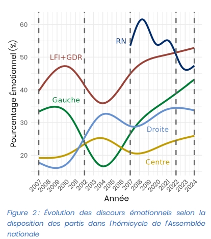 Les auteurs de l'étude montrent également que les interventions se font de plus en plus dans le registre « émotionnel » et de moins en moins « rationnel ». Ils montrent notamment qu'alors qu'il y avait environ 30% de discours « émotionnels » durant la 15e législature, il y en avait environ 40% pendant la 16e (voir la figure ci-dessous, extraite de l'étude).